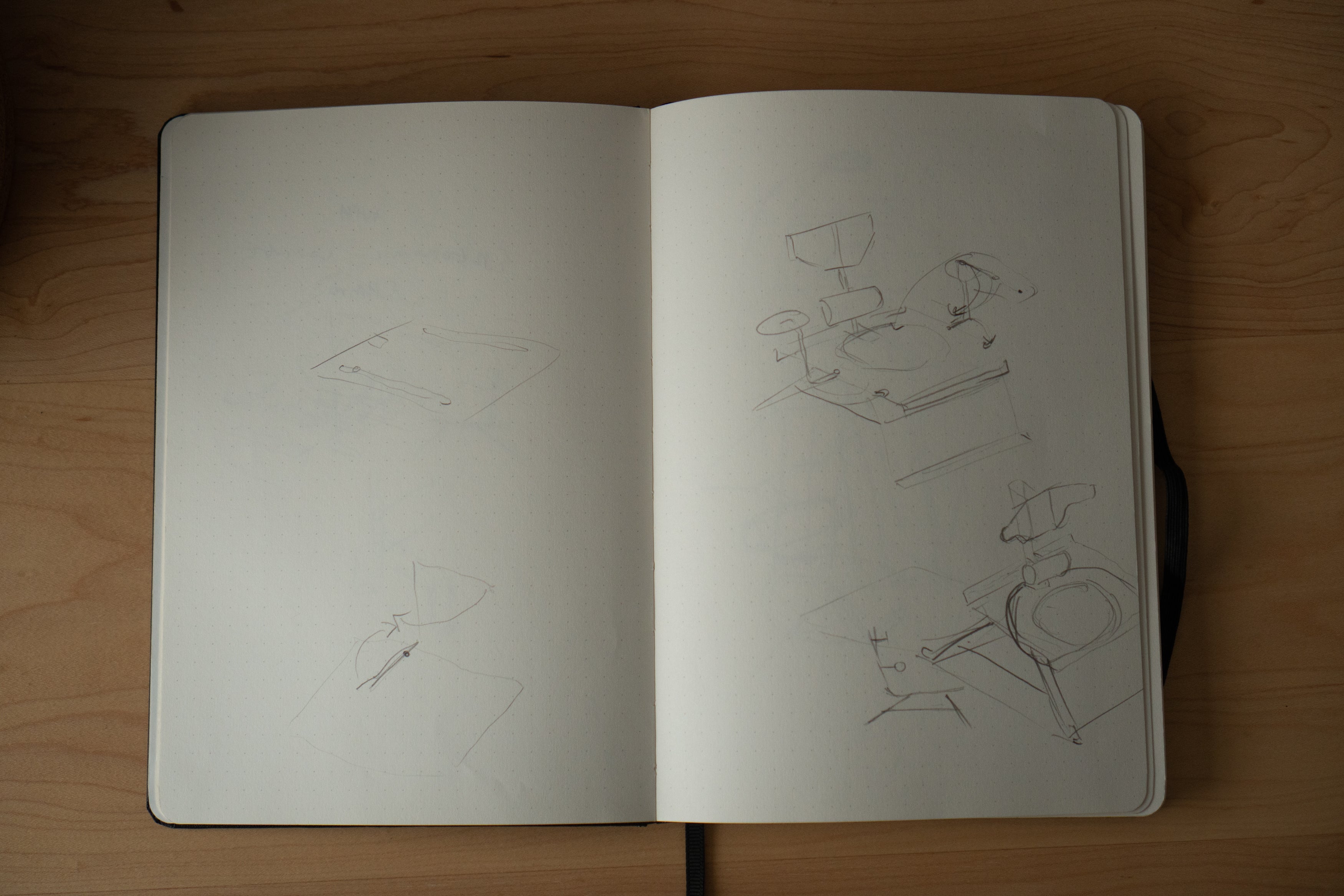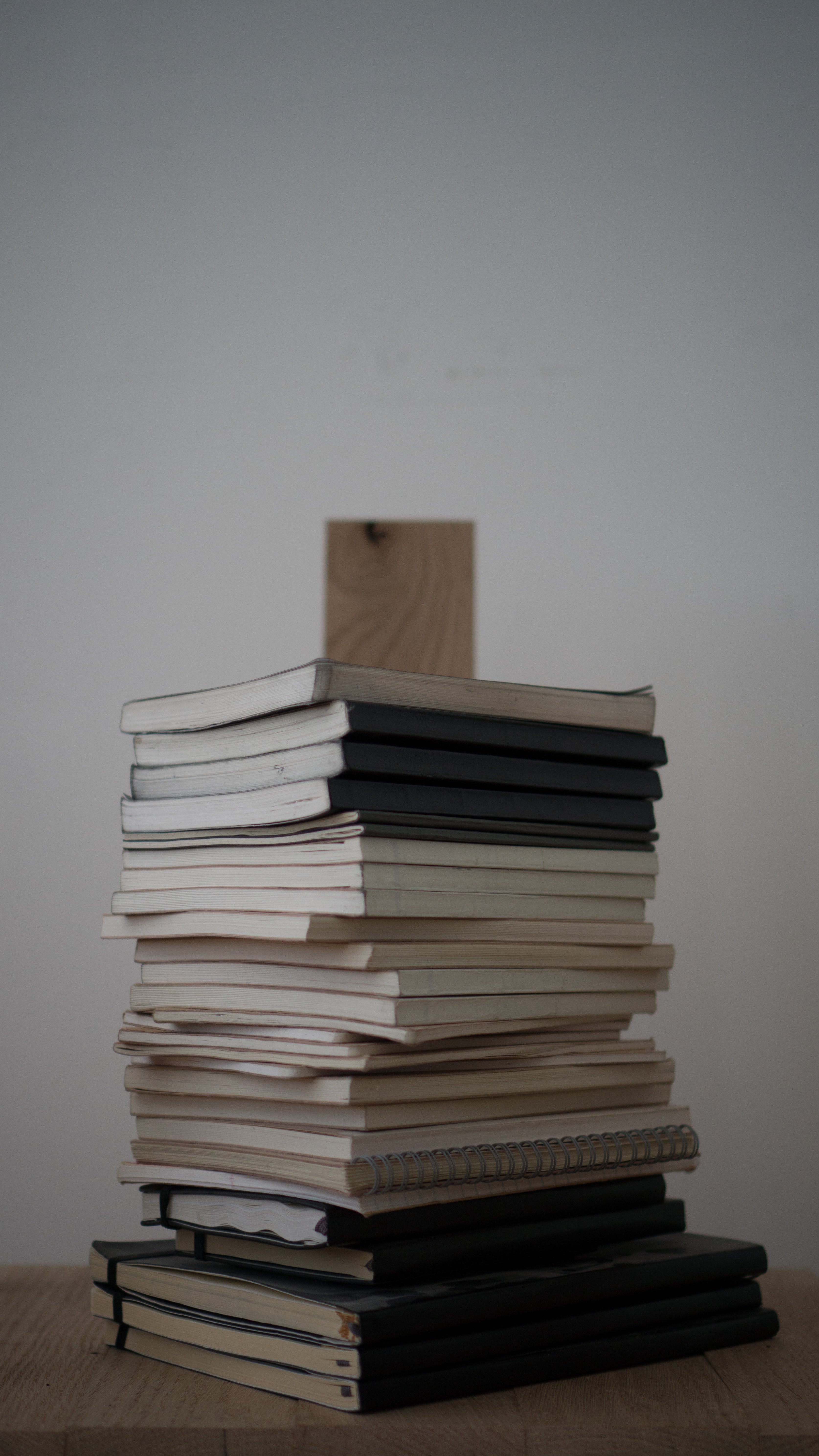 A pile of sketchbooks, with varying ideas for visual art and industrial design.