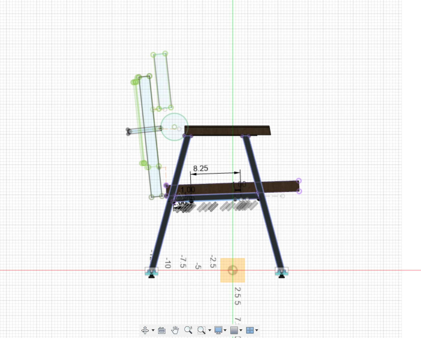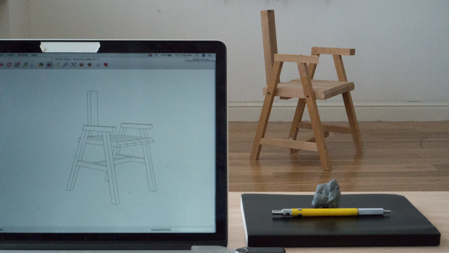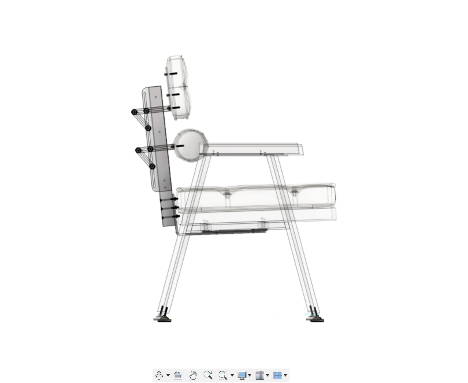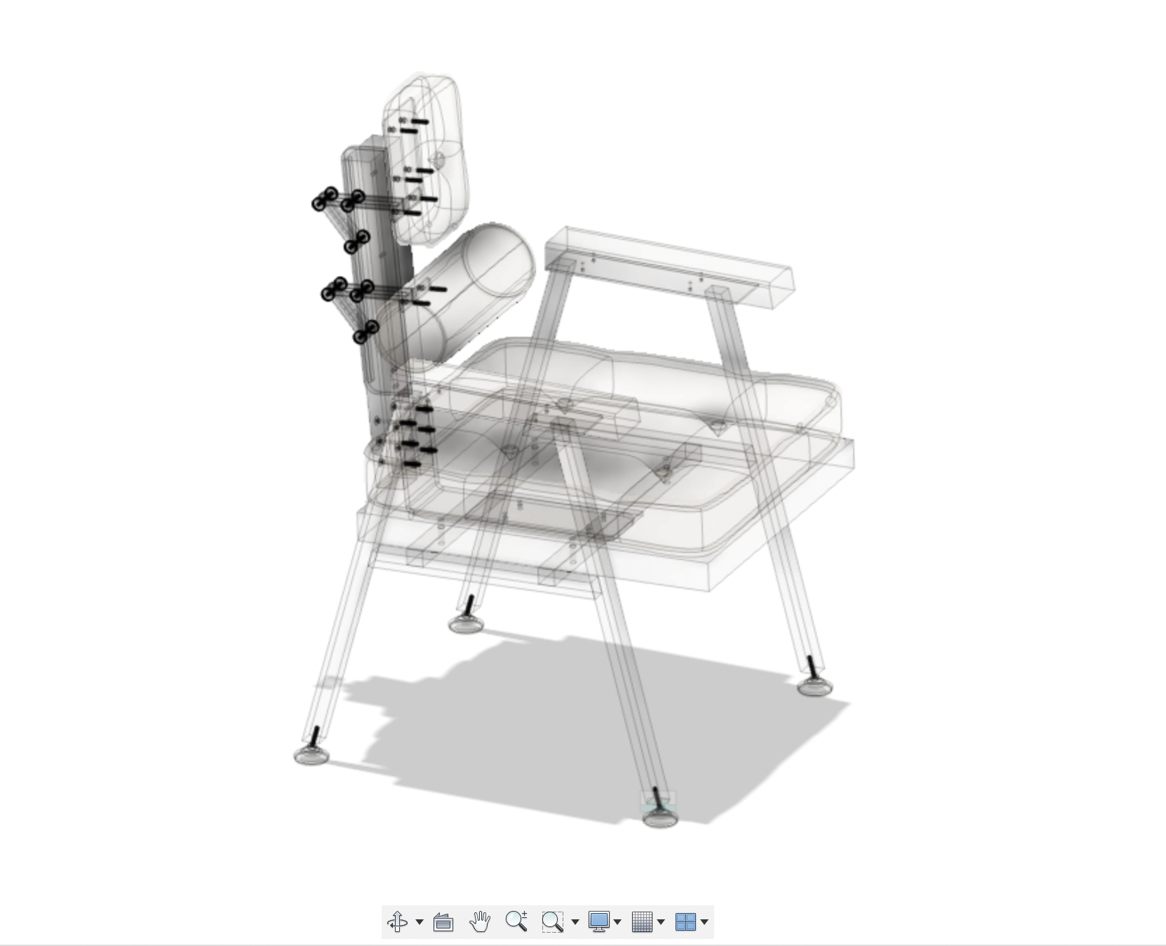 The chair was initially modeled in CAD, and continued to see iterations within the software. In this photo, there is a change in the proportions of the chair. It is wider, the cross framing is higher, and the arm rests are lower (too low). There is a search for finding the right aesthetic balance while maintaining functionally correct chair proportions.